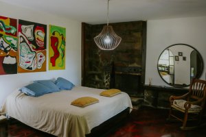 Posee una cama matrimonial, salamandra y un espacio de lectura con sillones.